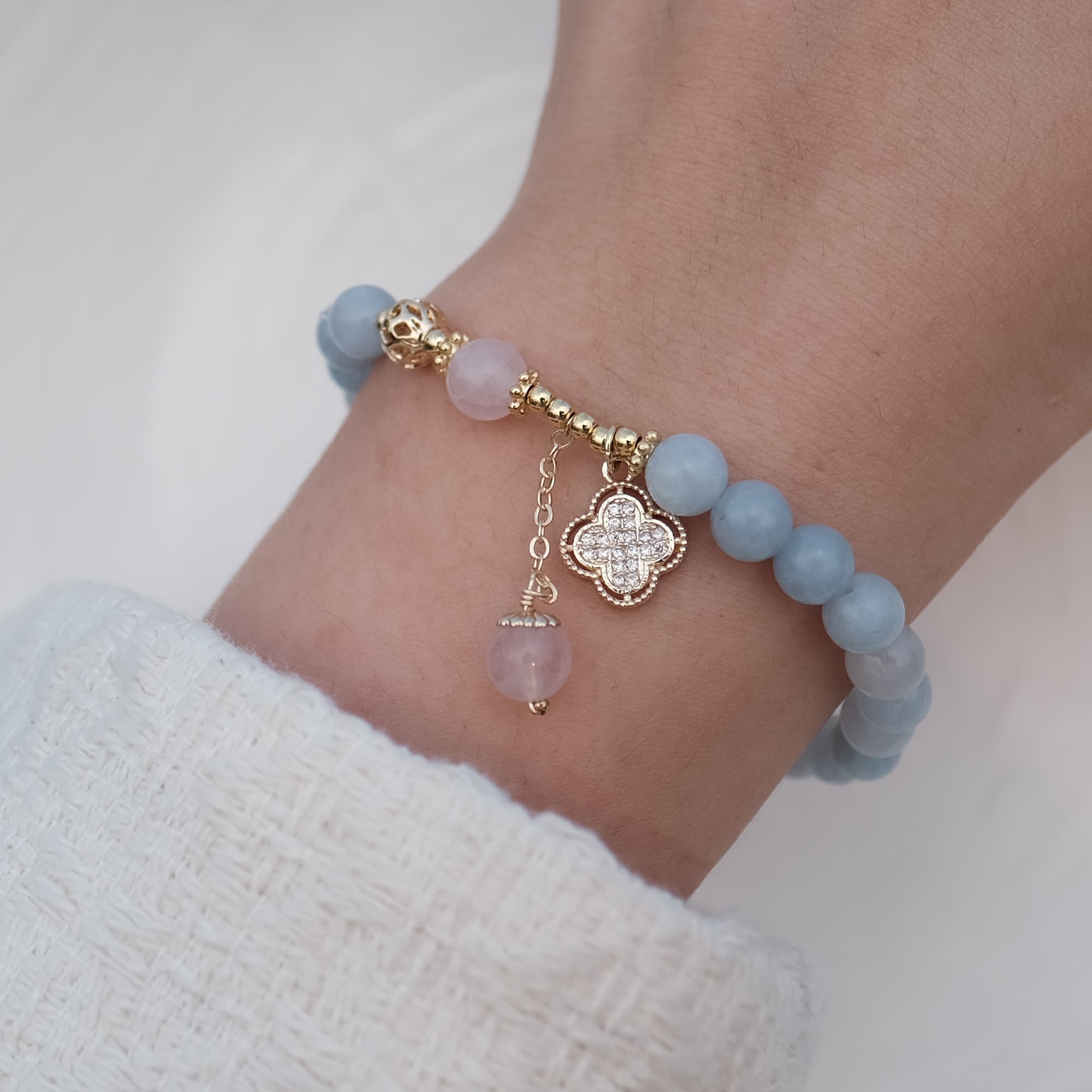 Clover Crystal Bracelet, adorned with a delicate 18-karat gold-plated clover motif with zirconium diamonds. Harness the serene energy of aquamarine to invite tranquility and mental clarity into your life. This crystal is celebrated for its remarkable capacity to instill calmness, alleviate stress, and navigate you through life's currents. This delicate piece also comes with 2 rose quartz beads for that little boost of love to come through.
